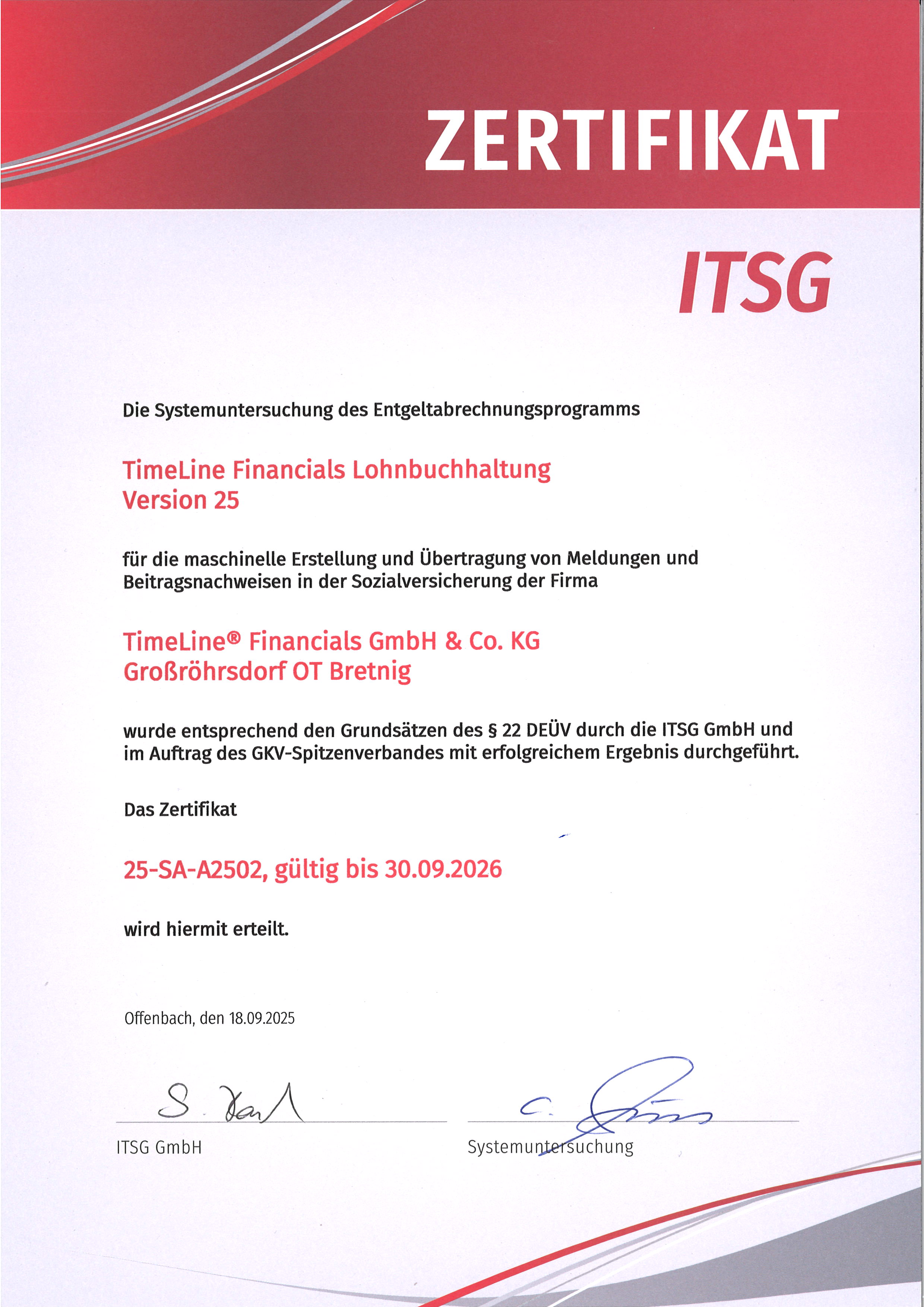 Am 09.09.2025 bestand die Lösung TimeLine® Personalwesen die diesjährige Qualitätskontrolle durch die ITSG GmbH. (Informationstechnische Servicestelle der Gesetzlichen Krankenversicherung). Die Software wird bei dieser Prüfung aus sozialversicherungsrechtlicher Sicht komplett auf Herz und Nieren geprüft.